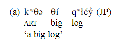 Adjectives are simple and complex. Simple adjectives are roots such as θí ‘big’, x̌éw̓s ‘new’, p̓ə́q̓ ‘white’, qə́l ‘bad’, and their plural and diminutive forms. Complex adjectives are formed from adjective roots and lexical suffixes. They can appear as a predicate head accompanied by particles only and may be expanded with other elements and can have nominal adjuncts. Adjectives do not have distinctions of aspect. In addition, adjectives appear preceded by auxiliaries less often than verbs, and may appear with nouns in nominal predicates expanded with more adjectives. They may also be preceded by adverbs acting as intensifiers. (Suttles, 2003, pp. 77-85)
