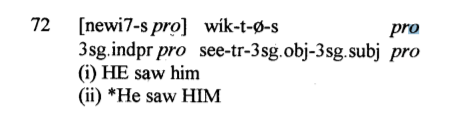 In Secwepemctsín, ambiguity arises when two third-person arguments are used within a clause. (Lai, 1998, p. 58)