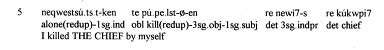 In English, words like myself, himself, herself, themselves, ourselves, etc., are typically described as anaphors while languages such as Halkomelem do not have these independent reflexive or reciprocal pronouns. (Gerdts & Hukari, 2000, p. 10)