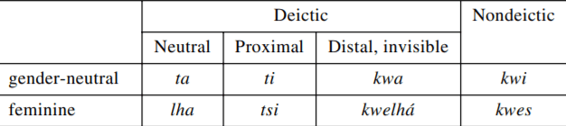 Gillon, C. (2009). Deictic features: Evidence from Skwxwú7mesh. IJAL, 75(1), 1-27.