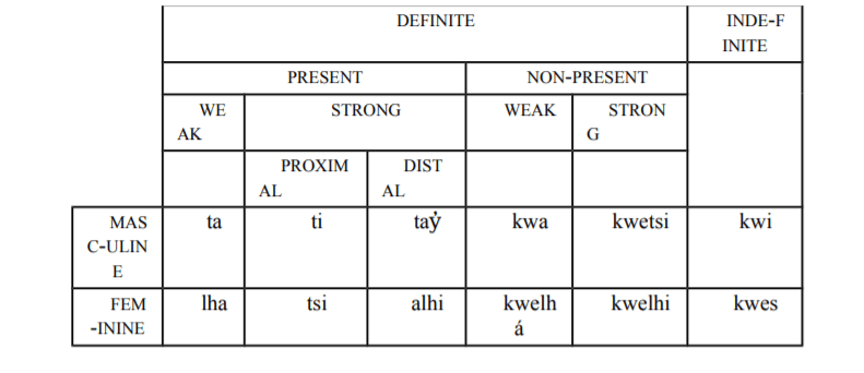 In Skwxwu7mesh, determiners are marked for several features: case, gender, and deixis. (Jacobs, 2011, p. 89) Feminine determiners are only used for single female humans and animals, and not plural. (Jacobs, 2013, p. 3)