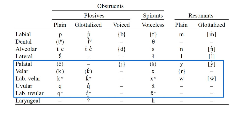 - The following phonemes, enclosed in blue, can be described as having the feature [dorsal], in Secwepemctsín.