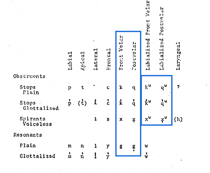 - The following phonemes, enclosed in blue, can be described as having the feature [dorsal], in Hul’q’umi’num’.