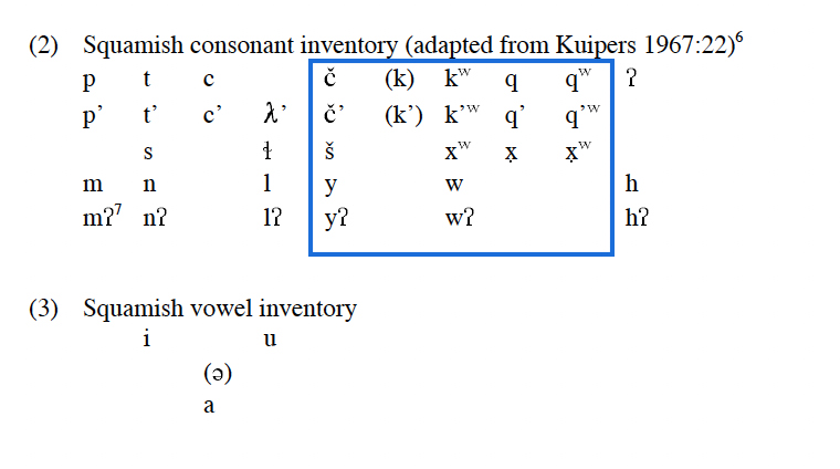 - The following phonemes, enclosed in blue, can be described as having the feature [dorsal], in Skwxwú7mesh. Note that all vowels are considered to have the [dorsal] feature.