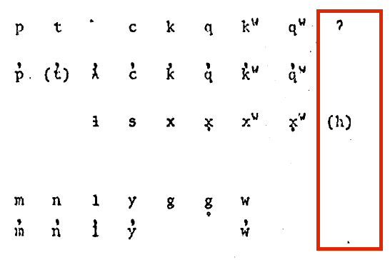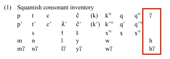 - Skwxwú7mesh: the sounds enclosed in red are articulated at the glottis