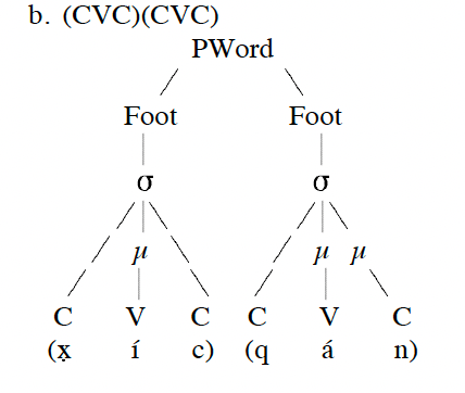 - In the example below, Dyck (2004) provides an analysis of the Skwxwú7mesh word xícqán, parsing the word into two feet. Both feet in this example are monosyllabic. Syllables are indicated by the σ character.