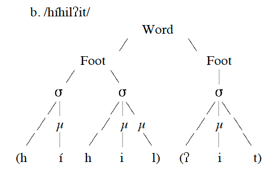 - Compare the example above to the following example below, also provided by Dyck (2004). Here it can be seen that the first foot, /híhil-/ is parsed into two syllables, and then two syllables are parsed into a foot. Of the two syllables in the first foot, it is the leftmost syllable receiving primary stress.