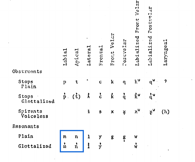 - The following phonemes enclosed in blue are members of the [+nasal] natural class in Secwepemctsín.
