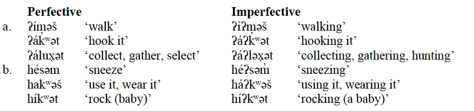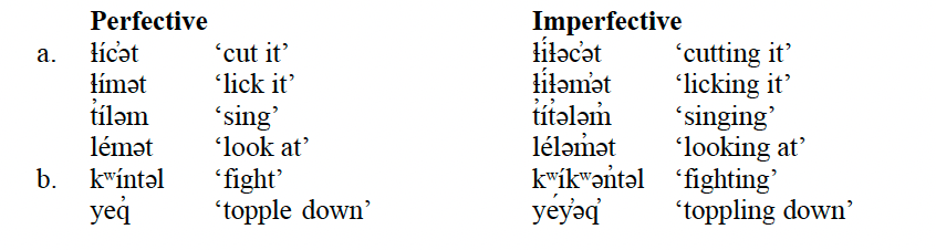 For example, in the case of stems in the shape of CVX with no /ʔ/ or /h/ segments, containing a full vowel, the imperfective allomorph arises by reduplication of the first CV sequence of the stem. This can be seen in the example below: