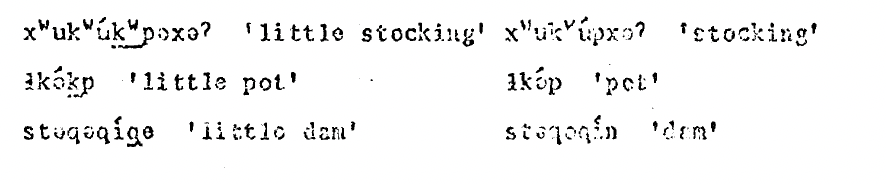 - Secwepemctsín: Gibson (1973) describes the process of creating diminutives in Secwepemctsín as being a regular morphological process (p. 47-48). Diminutives are expressed by: