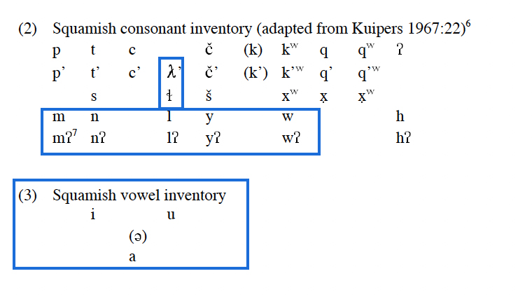 - The following phonemes enclosed in blue are possible members of the [+sonorant] natural class in Skwxwú7mesh.
