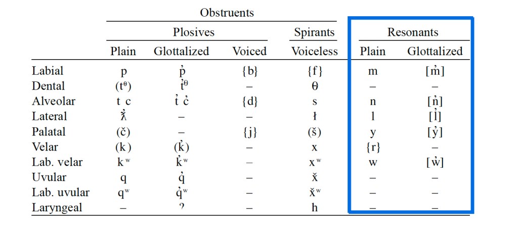 - The following phonemes enclosed in blue are possible members of the [+sonorant] natural class in Secwepemctsín. It should be noted that all vowels are also [+sonorant].