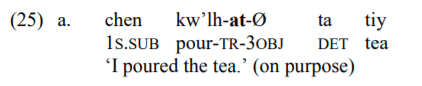 Example in the Skwxwu7mesh Context of Stem kw’lh Immediately Followed by Transitivizer -at (Jacobs, 2011, p. 50)