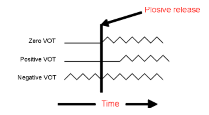 - Zero VOT: this occurs when an unaspirated voiceless plosive is followed by a sonorant where voicing occurs immediately after the release of the plosive. Due to the immediate voicing (and vocal fold vibration) the onset time is almost 0 ms.