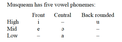 The following examples outline the vowels found in Hul’q’umi’num’, Skwxwú7mesh, and Secwepemctsin. Vowels are given in IPA and do not necessarily correspond to Roman orthography.